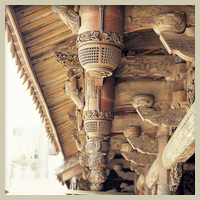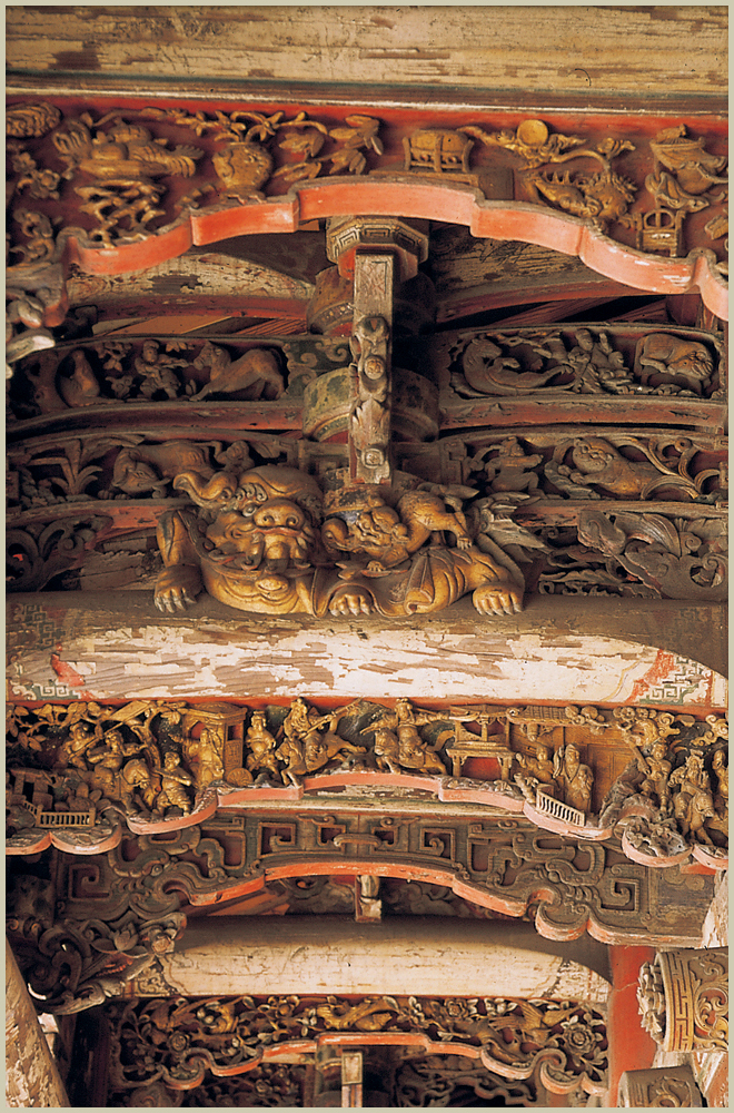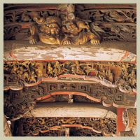 五門殿前簷下方有一排吊筒,雕刻有各式各樣的花籃造型,其上裝飾有古錢或蓮花,吊筒的正面並裝飾有飛天、鳳凰及三腳蟾蜍等木雕,造型優雅樸實,吊筒後方的斗栱則採碗型的斗及關刀型的栱,為泉州溪底匠派所擅長的做法。樑架上的獅座及枋木的雕刻樸拙,為泉州匠師的作品。