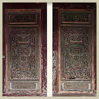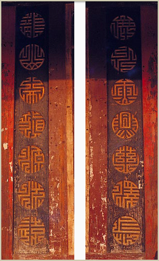 五門殿正門兩旁有一幅木刻對聯,採「圓篆體」雕刻,其上書: