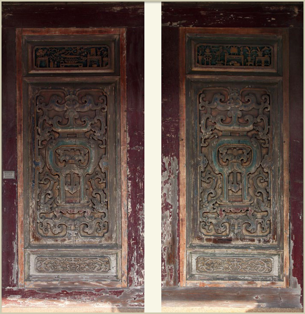 五門殿正面兩側有夔龍窗木雕,其圖案源自於《易經》〈繫辭傳〉:「易有太極,是生兩儀,兩儀生四象,四象生八卦」,兩儀代表陰儀與陽儀,四象為四方之象,即春夏秋冬,木雕的圖案中分別以兩隻鯉魚及四隻夔龍來表達,又象徵「鯉魚躍龍門」,有祈求「登科取士,金榜高中」之意。