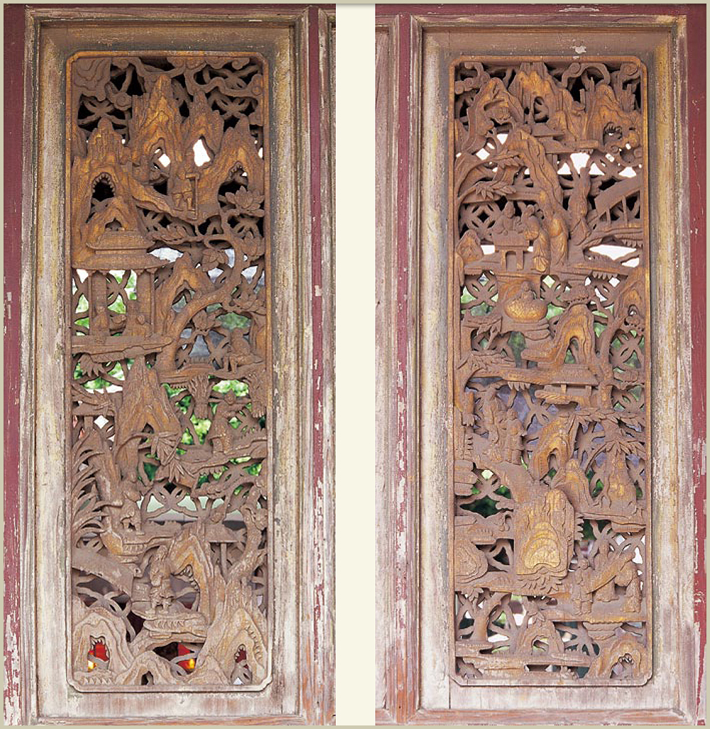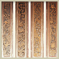 四象外圍有八卦的造型,八卦的四隅各有四隻蝙蝠,代表「賜福」,中間的圓周則有爻卦的圖騰:「乾三連,坤六斷,離中虛,坎中滿,震仰盂,艮覆碗,兌上缺,巽下斷」。龍邊為「先天八卦」圖騰,虎邊則採「後天八卦」圖騰,匠師採用雙面透雕的工法,內外的圖案相同。八卦窗兩旁的人物木雕,正面以「漁樵耕讀」及「琴棋書畫」為題材,背面則採用象徵「富貴吉祥」的圖案。