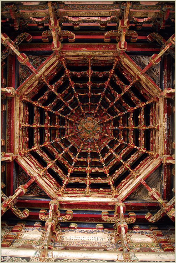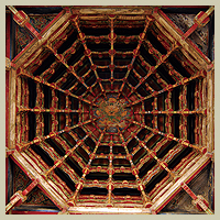 藻井是建築物頂棚中最尊貴的作法,除了能塑造室內富麗堂皇的效果,更具有隔斷過高的空間以保持室溫及避免灰塵下落的功能。早期的藻井為方井,至遼、宋、金時期,藻井出現了「斗八藻井」,形狀成八角造型,由斗栱支撐,逐層向上縮小,形成穹窿式的造形。「藻井」,台灣的匠師稱為「蜘蛛結網」。