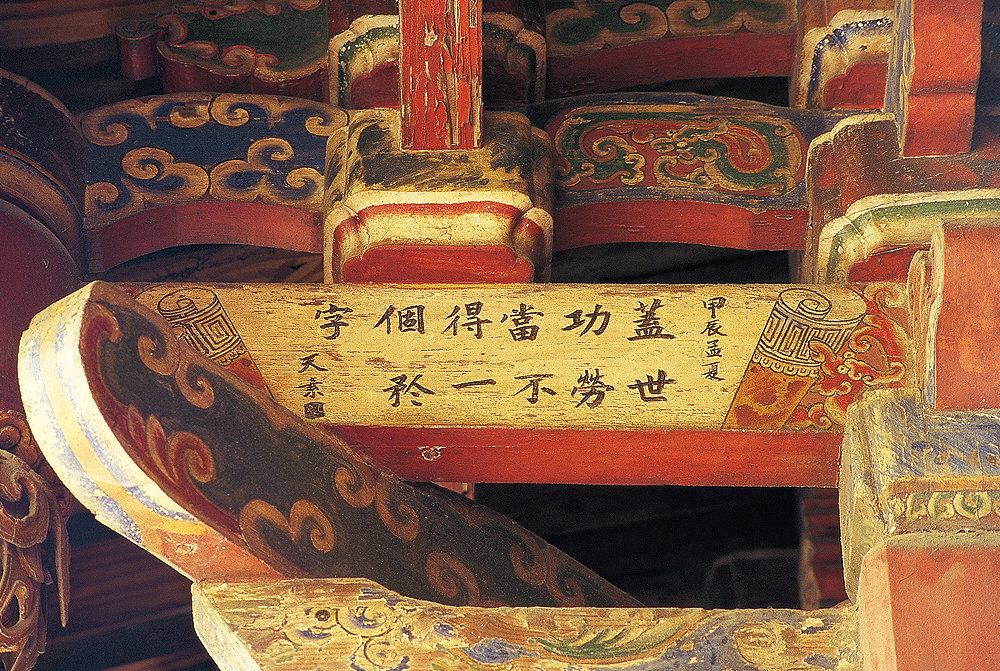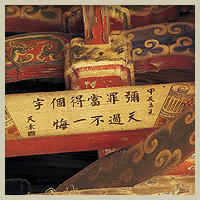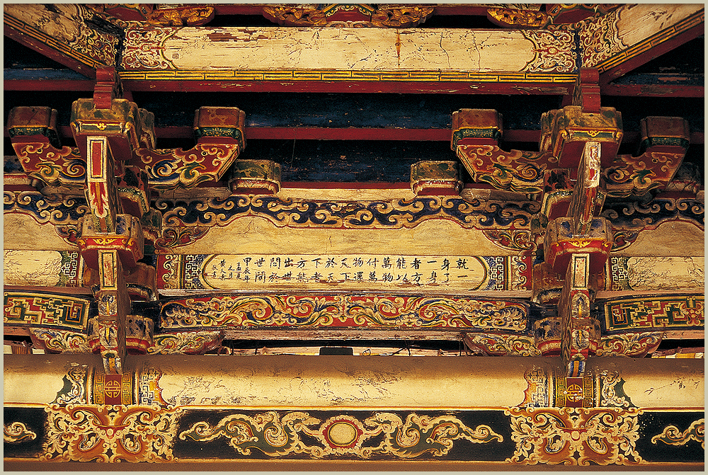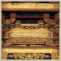 八卦藻井彩繪 戲台八卦藻井內的彩繪是郭新林在民國五十三年所完成的作品,壽樑上可見郭新林的親筆落款,垛頭的藻飾點綴著八卦藻井,更顯得富麗堂皇,枋心內有鹿港名書法家黃天素的字跡,其上書: