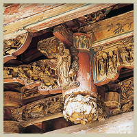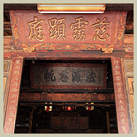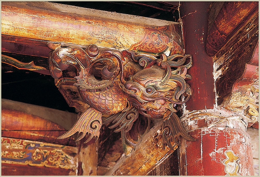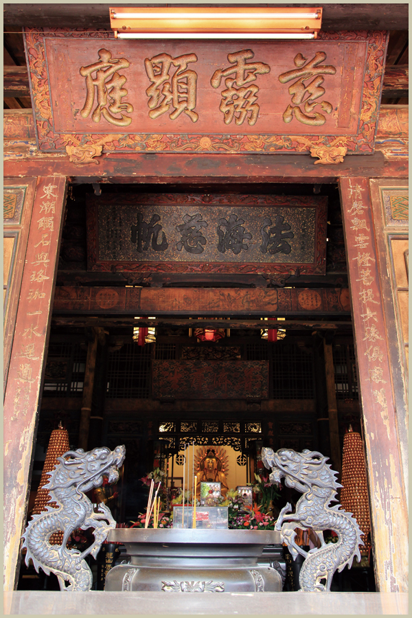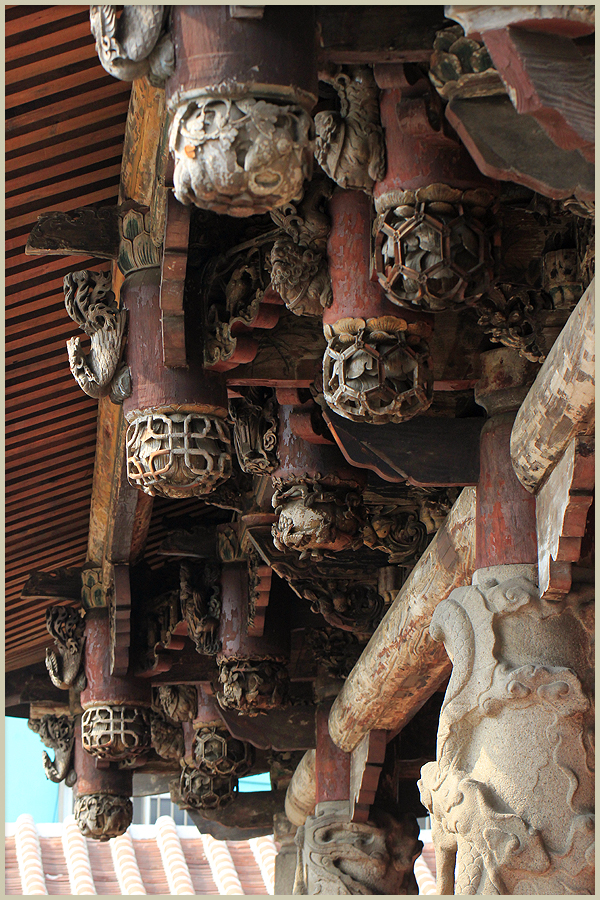 拜殿壽樑與木柱交角的地方,有一對龍頭魚尾造型的木雕,為龍生九子中的「螭吻」,「螭吻」性好吐水,裝飾在建築物上,有防火災的喻意。文人視此龍頭魚尾的造型為鰲魚,有「獨佔鰲頭、科舉高中」的意涵。由於龍身雕有翅膀,鹿港匠師稱之為「飛魚」。