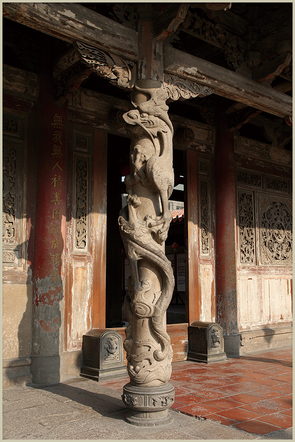 這對龍柱造型為龍邊龍身由上往下隨雲臨降,虎邊龍身由下向上翻騰,《易經》的概念中,乾為天、為陽、為上、為父,坤為地、為陰、為下、為母,這種一上一下的龍柱造型,稱為「乾坤交泰」,象徵「天地之氣交和,萬物生生不息」之意。台灣現僅有兩對此種造形的古石雕龍柱,另一對在屏東內埔天后宮的前殿。