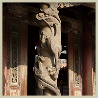 龍柱柱身高二六十公分,直徑三十公分,柱身與柱珠接縫處置有墊片,為當年匠師調整柱身穩定平衡之用。龍柱的柱珠採圓形青斗石雕刻,柱珠上雕有花鳥瑞獸等吉祥圖案,柱珠及磉石採獨立分開,有別於山門一體成型的柱珠柱礎。