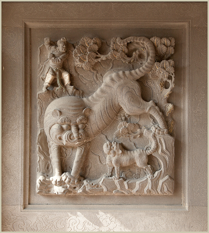 五門殿兩旁的龍、虎堵石雕,均採深浮雕方式,龍堵的石雕構圖中,龍在空中騰雲駕霧,下方雕飾有二隻鯉魚,並以岩石做成禹門的造型,象徵「魚躍龍門」。雲龍的下方有一人物做降龍狀,即佛教十八羅漢中的「降龍尊者」,其衣服著有青色的顏料,也符合了五行的色彩。虎堵的石雕,老虎由山稜縱躍而下,回首凝視身邊的小老虎,旁邊的松樹隨風搖曳,有「虎嘯生風」之勢,而在左上方有一人物做伏虎狀,此人為「伏虎尊者」。佛教原有十六羅漢,在漢化後,再加上降龍與伏虎羅漢,是為十八羅漢。