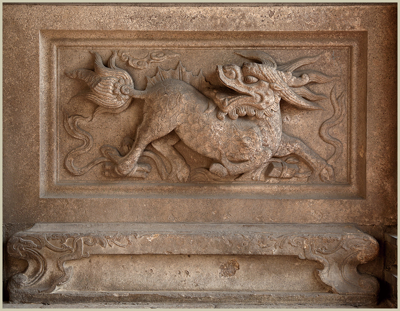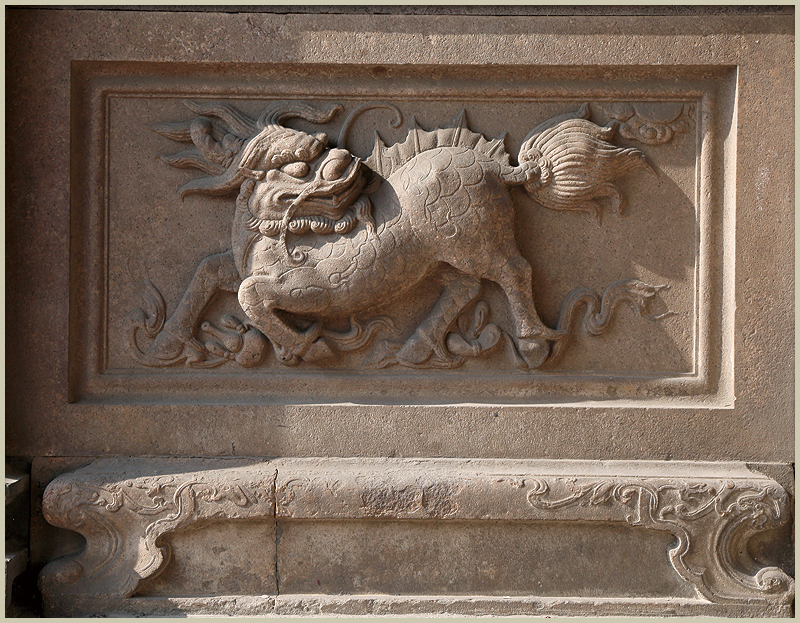 麒麟為傳統祥瑞動物,公曰麒,母曰麟。《說文》:「麒,仁獸也,麋身、牛尾、一角; ,牝麒也」,說明了麒的母型是由鹿所演變而來。在漢代畫像中,麒麟為鹿的造型,差別在於麒麟為獨角走獸。經過歷代的變化,到了明代,即是我們現在所看到的麒麟造型。明史中記載:「明成祖永樂十三年(一四一五)西域使者進貢,獻上一隻長頸鹿,曰之:麒麟」。