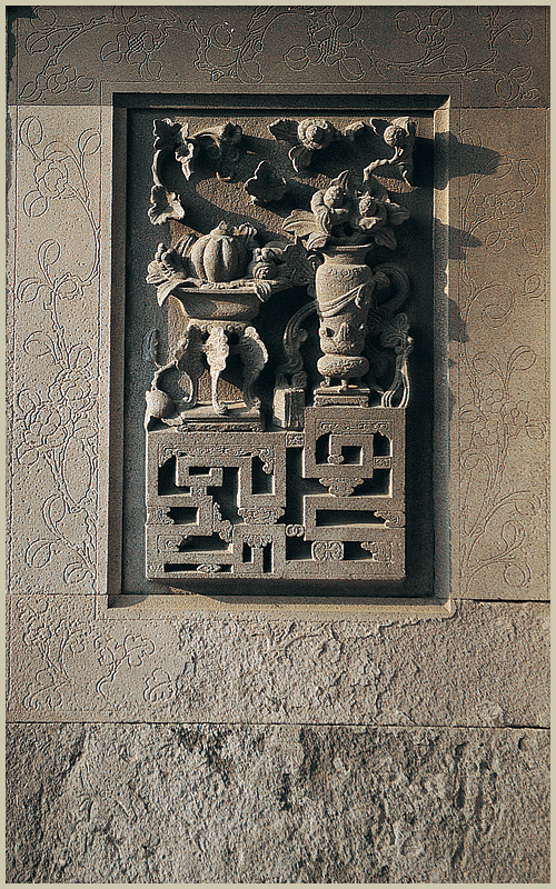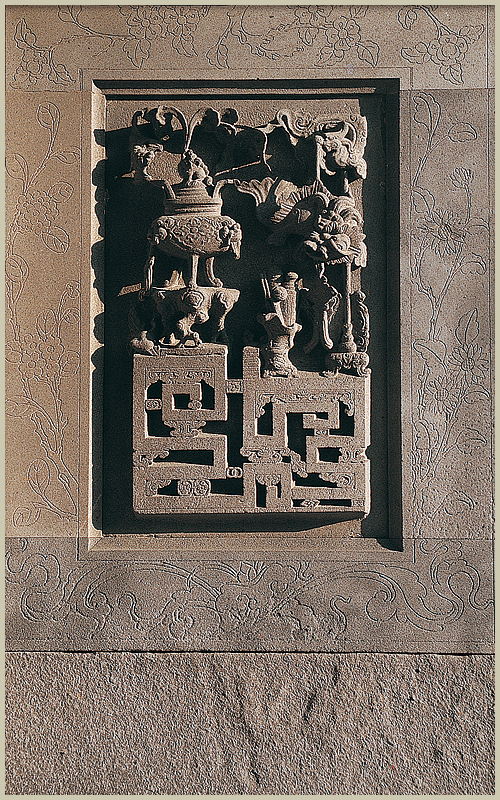 五門殿身堵的博古石雕採深浮雕,分別代表「香、花、燈(茶)、果」,為禮佛時的四種基本物品。龍邊博古圖騰中香爐的左上方有一隻蝙蝠,象徵「福」,左下角有一顆桃子,象徵「壽」,香爐取其諧音為「祿」,整體造型象徵「福祿壽」。香爐的爐蓋有一隻動物,名為「狻猊」,其性好煙,故置於香爐上,是龍生九子之一。博古架上燈座上掛有龍頭魚尾的燈籠造型,象徵「獨佔鰲頭」。虎邊的博古圖騰雕刻牡丹、花瓶及案桌,代表「富貴平安」,旁邊有「南瓜、石榴、佛手柑」,代表「多子多孫多福」之意。