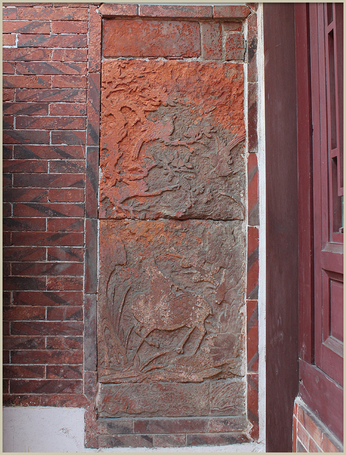 龍山寺兩側川廊自五門殿、正殿、後殿分別為拱門、八卦門及圓門,不同型式的門扇,不僅增加空間設計的變化,也讓民眾置身其中,心隨境轉。後殿圓門的後方,有龍山寺僅存的磚雕作品。穿過後殿兩側圓門,即為早年住持起居的地方。龍邊廂房內的木屏壁堵上,保存有歷史悠久的書法墨跡,其上書:
