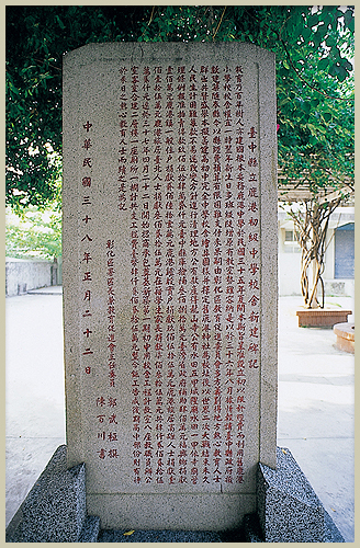 民國三十六年鹿港神社舊址改建為鹿港初級中學校舍時,將此座石碑磨平,改刻「臺中縣彰化區鹿港初級中學校舍新建碑記」,此碑現立於鹿港國中校園內。