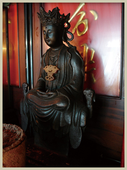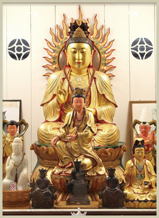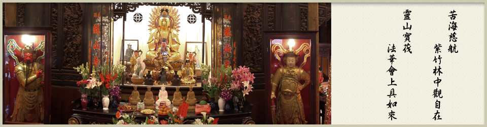 觀音塑像正殿內最大尊的觀音佛像,及左右護法韋馱、伽藍尊者之像,為民國五十年由齋姑王金珠至台北迪化街「盧山軒」佛像店訂塑,佛像係採用「脫胎法」塑造,其工序為工匠先做一模具,外層再重覆披布上漆,塑成佛像後再取出模具。