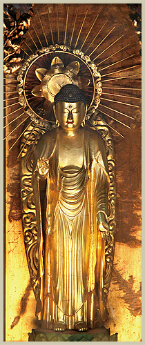 日治時期,原台灣的佛寺均被強納為屬於日本淨土宗或淨土真宗佛寺的分寺,其主神均供奉自日本的立姿阿彌陀佛像。明治三十六年(一九○三)鹿港龍山寺成為日本真宗本派本願寺的分寺後,明治三十八年(一九○五)自京都本願寺大本山運送御授木雕阿彌陀佛像,此尊阿彌陀佛像為立姿,後方有太陽的光芒,為日本佛像的特色之一。神龕的造型為「唐博風」風格,神龕的屋頂斗栱,層層出挑,外觀彷佛一座小型的佛寺。