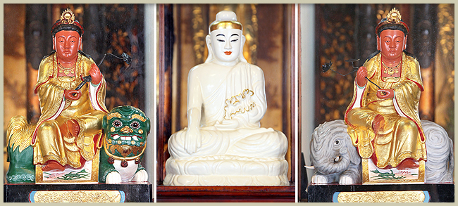 釋迦牟尼佛龍山寺後殿供桌前,由信徒迎奉釋迦牟尼佛,左右脅侍分別為文殊菩薩、普賢菩薩。左脅侍文殊菩薩專司「智慧」,坐騎為一青獅,表示威猛,能降伏一切邪魔。右脅侍普賢菩薩專司「理德」,坐騎為一六牙白象,表示大慈善心。